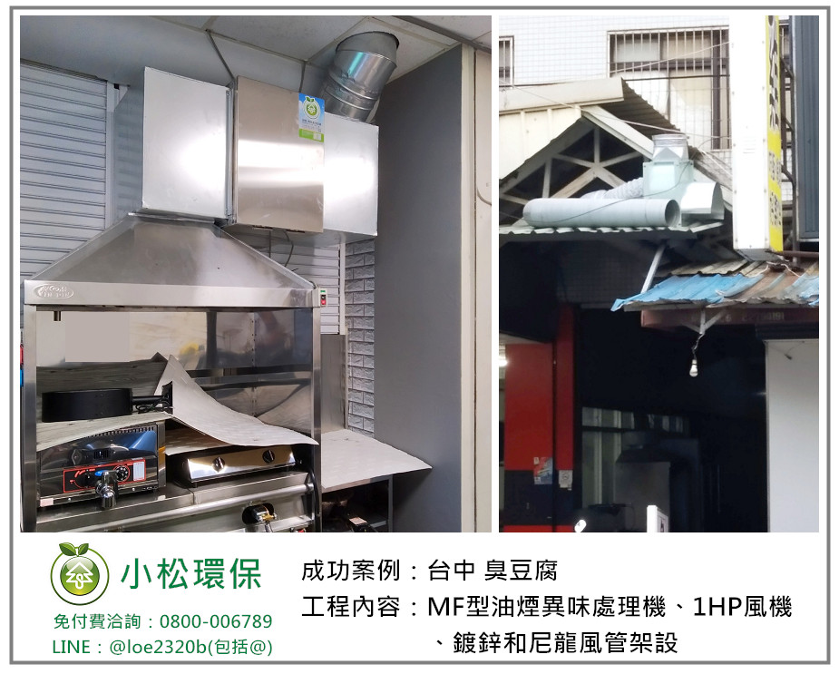小松環保於 台中 臭豆腐 安裝一套餐飲業油煙/異味處理設備,包括 MF型油煙異味處理機、1HP風機、鍍鋅和尼龍風管架設。