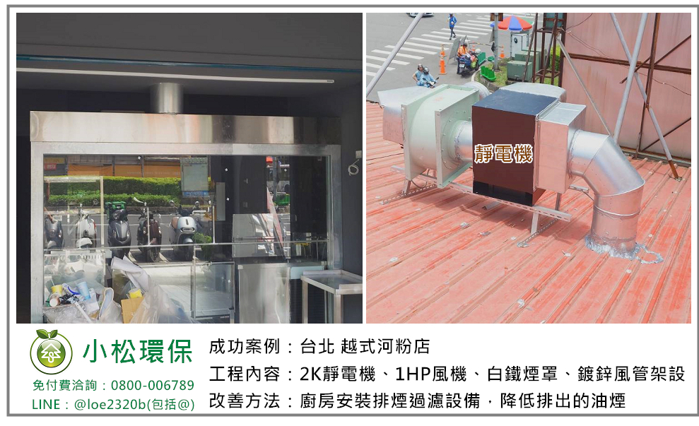 小松環保於 台北 越式河粉店 安裝一套餐飲業油煙/異味處理設備,包括 2K靜電機、1HP風機、白鐵煙罩、鍍鋅風管架設。
