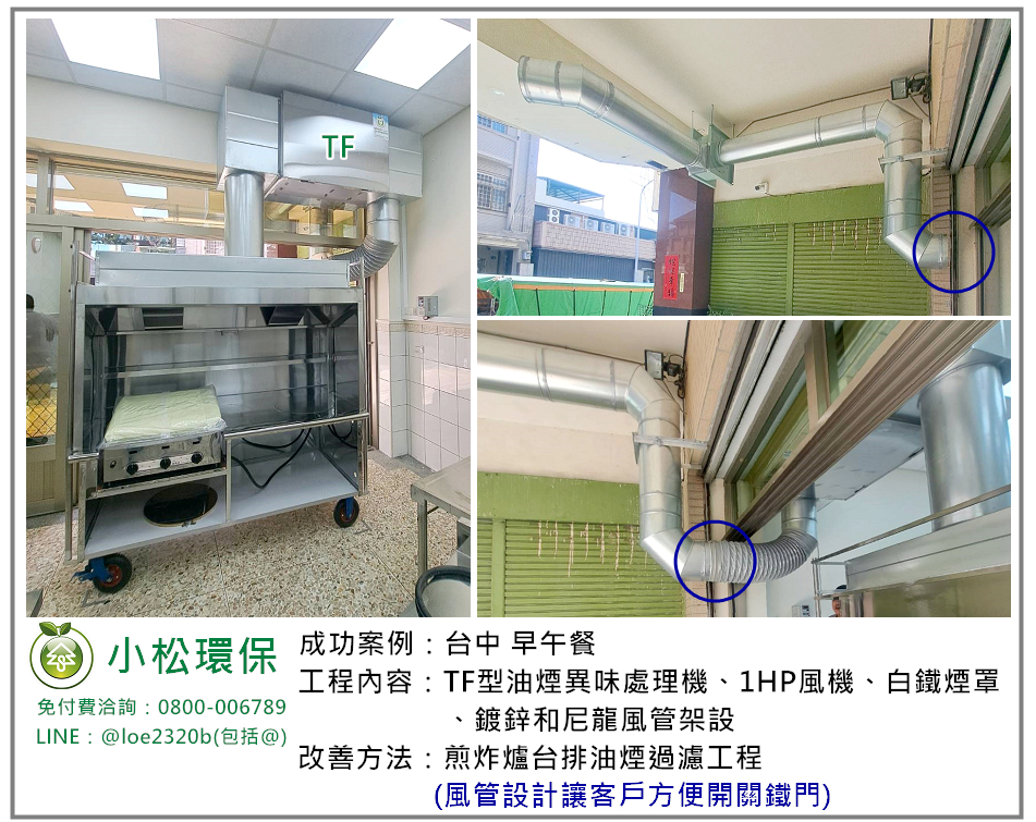 小松環保於 台中 早午餐 安裝一套餐飲業油煙/異味處理設備,包括 TF型油煙異味處理機、1HP風機、白鐵煙罩、鍍鋅和尼龍風管(風管設計讓客戶方便開關鐵門)架設。