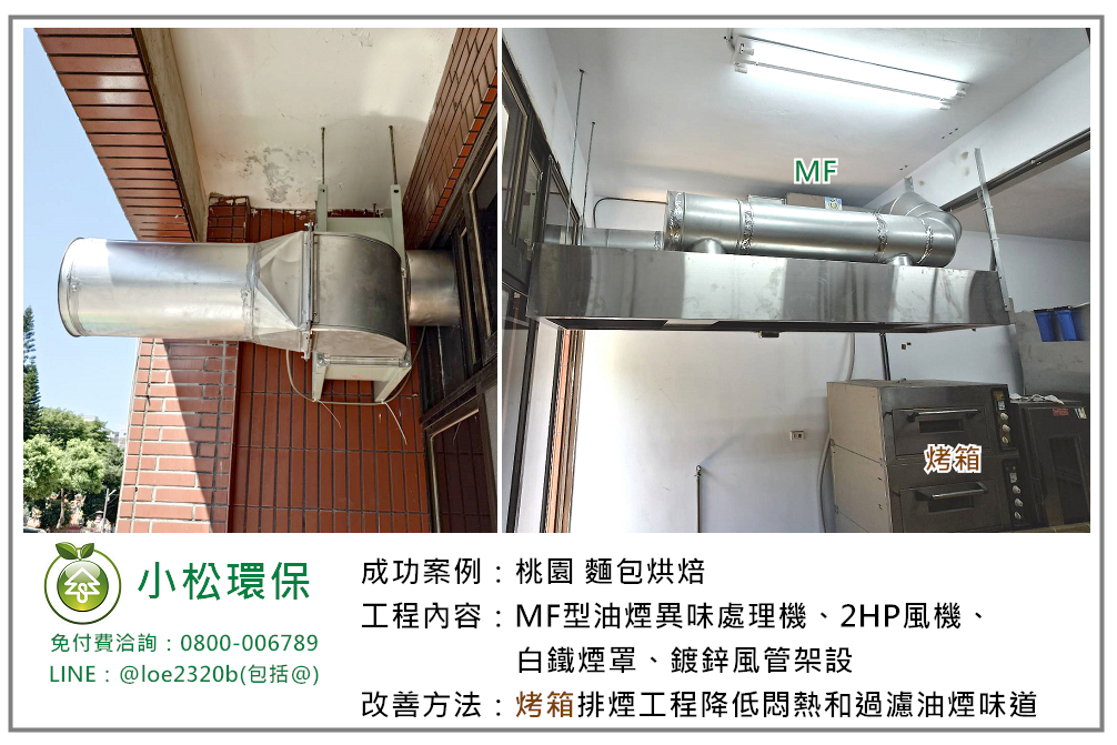 小松環保於 桃園 麵包烘焙 安裝一套餐飲業油煙/異味處理設備,包括 MF型油煙異味處理機、2HP風機、白鐵煙罩、鍍鋅風管架設。