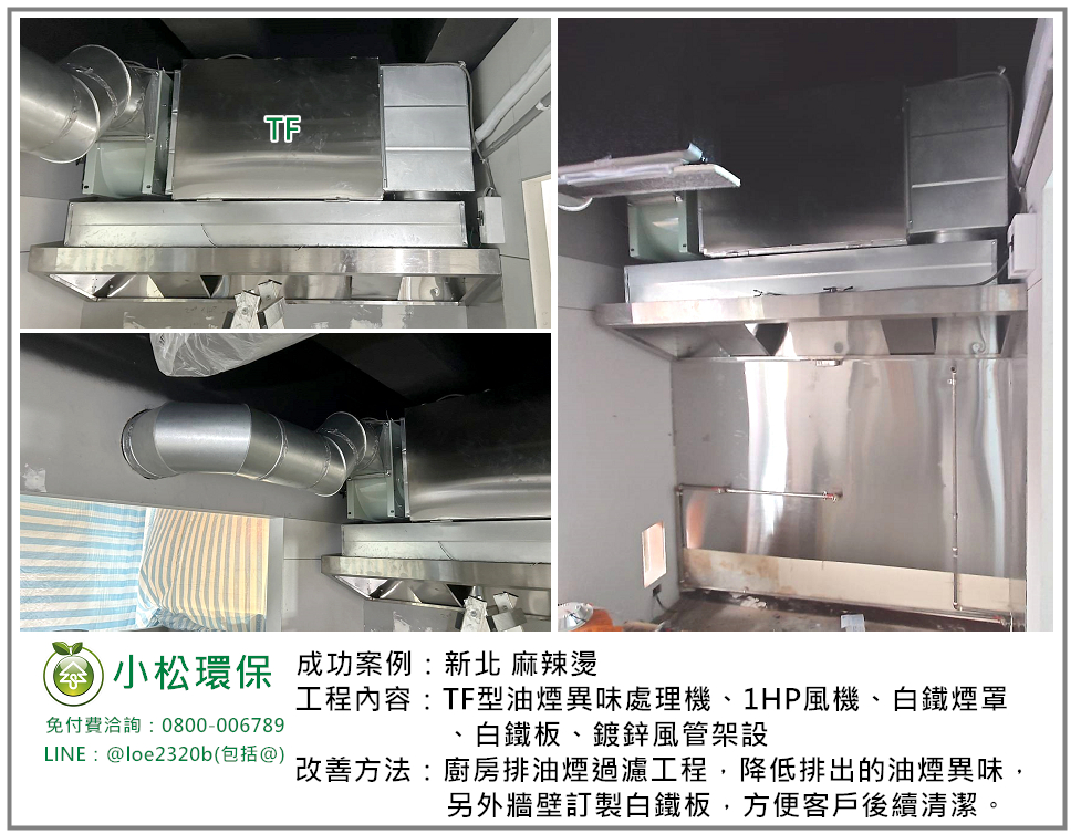 小松環保於 新北 麻辣燙 安裝一套餐飲業油煙/異味處理設備,包括 TF型油煙異味處理機、1HP風機、白鐵煙罩、白鐵板、鍍鋅風管 架設。