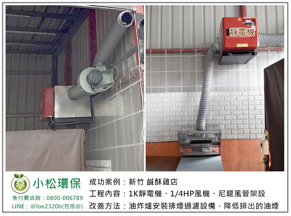 小松環保於 新竹 鹹酥雞店 安裝一套通風排煙工程,包括 1K靜電機、1/4HP風機、尼龍風管架設。