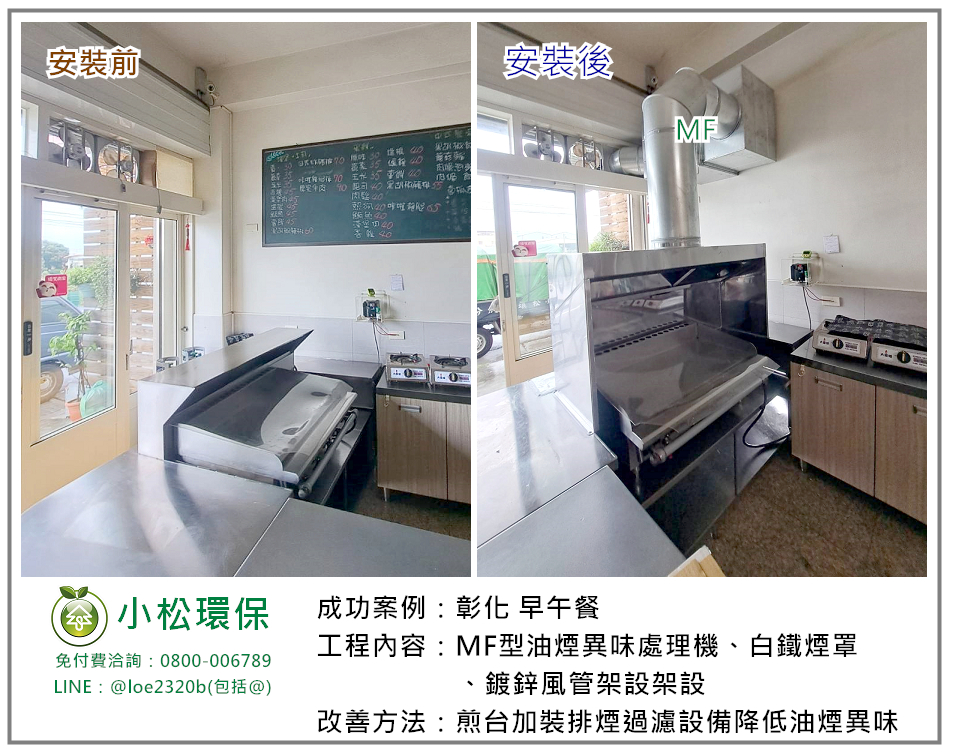 小松環保於 彰化 早午餐 安裝一套餐飲業油煙/異味處理設備,包括 MF型油煙異味處理機、白鐵煙罩、鍍鋅風管架設。