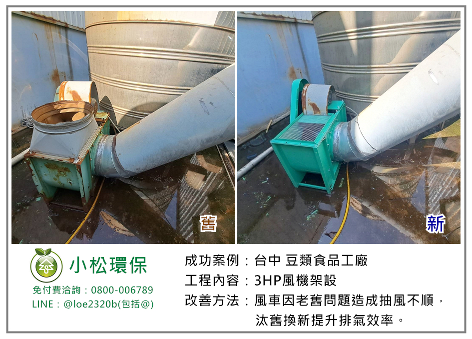 小松環保於 台中市 豆類食品工廠 安裝一套通風排煙工程,包括 3HP風機架設(汰舊換新)。