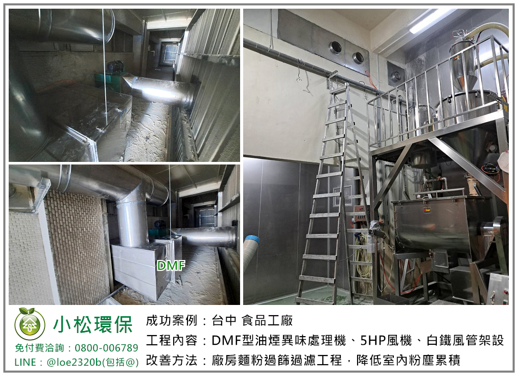 小松環保於 台中 食品工廠 安裝一套餐飲業油煙/異味處理設備,包括 DMF型油煙異味處理機、5HP風機、白鐵風管架設。