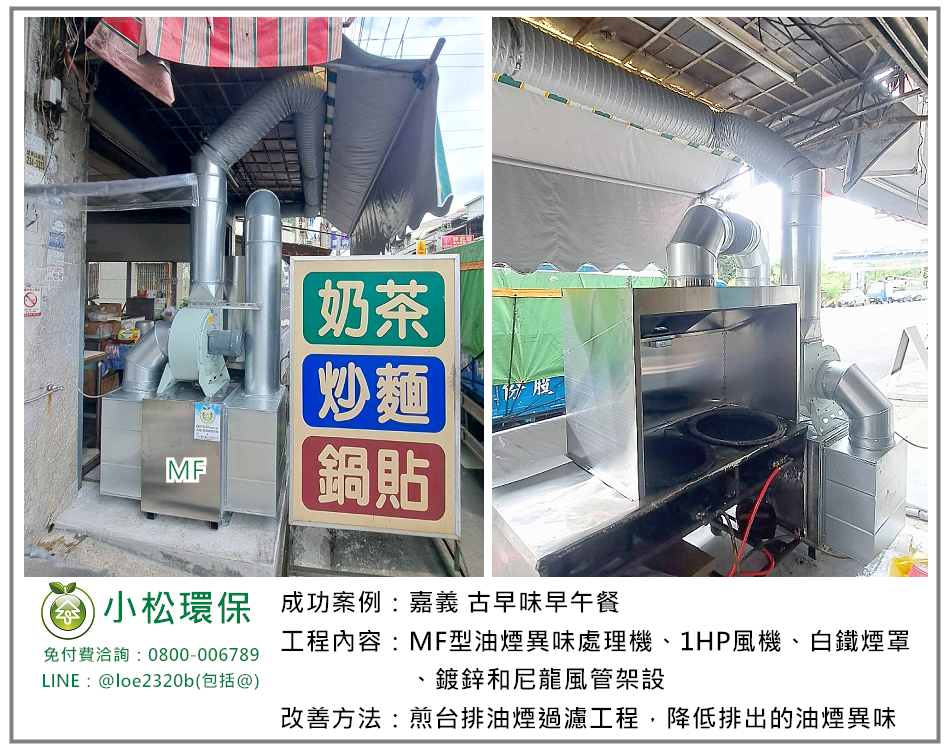 小松環保於 嘉義 古早味早午餐 安裝一套餐飲業油煙/異味處理設備,包括 MF型油煙異味處理機、1HP風機、白鐵煙罩、鍍鋅和尼龍風管架設。