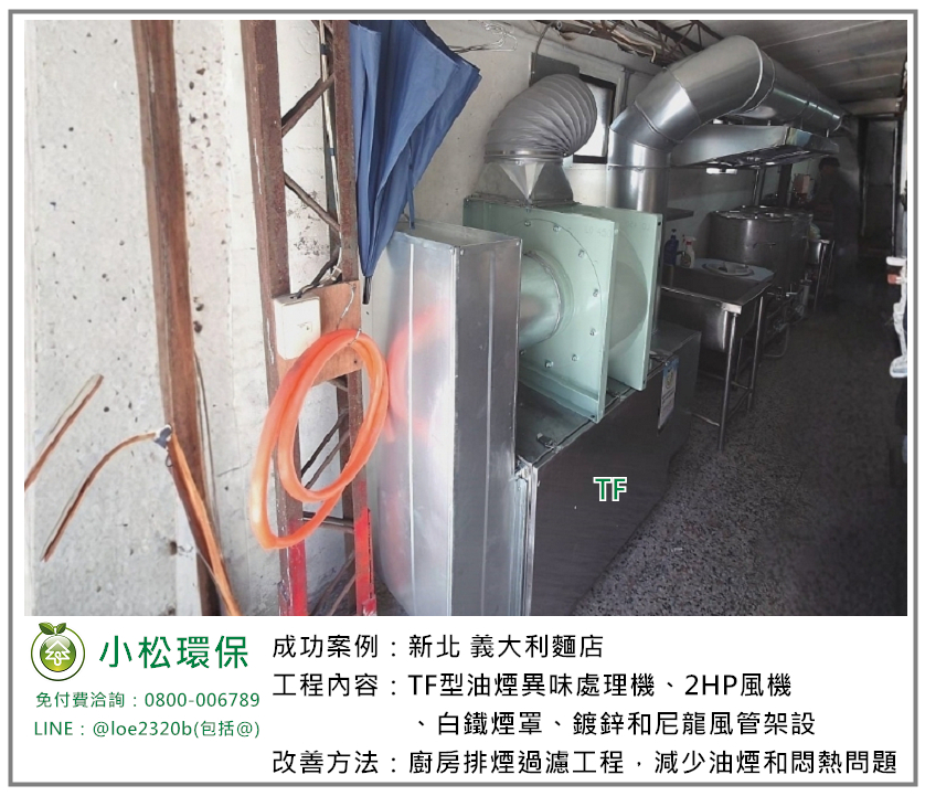 小松環保於 新北 義大利麵店 安裝一套餐飲業油煙/異味處理設備,包括 TF型油煙異味處理機、2HP風機、白鐵煙罩、鍍鋅和尼龍風管架設。