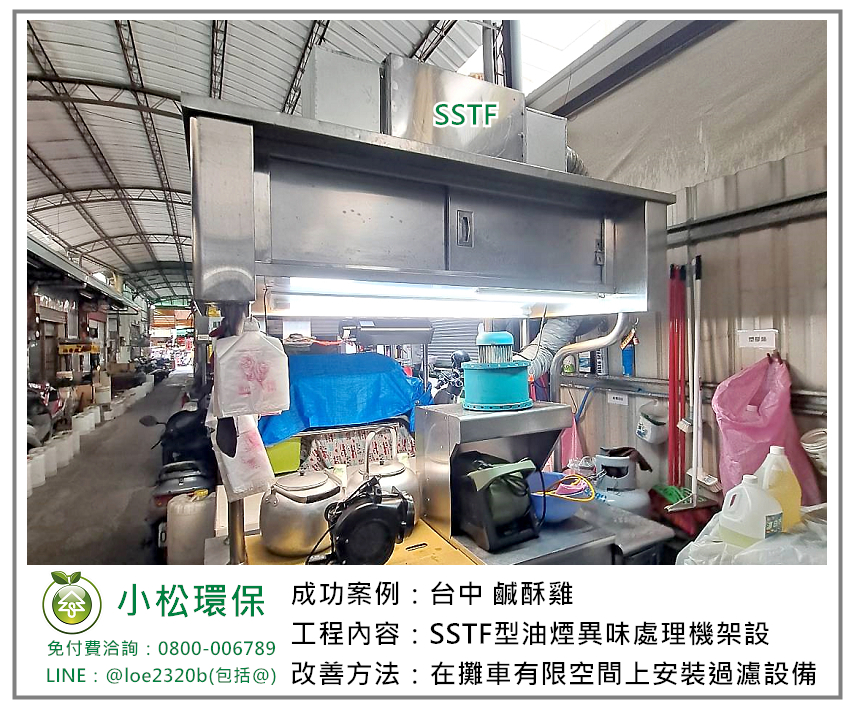 小松環保於 台中 鹹酥雞店 安裝一套餐飲業油煙/異味處理設備,包括 SSTF型油煙異味處理機架設。
