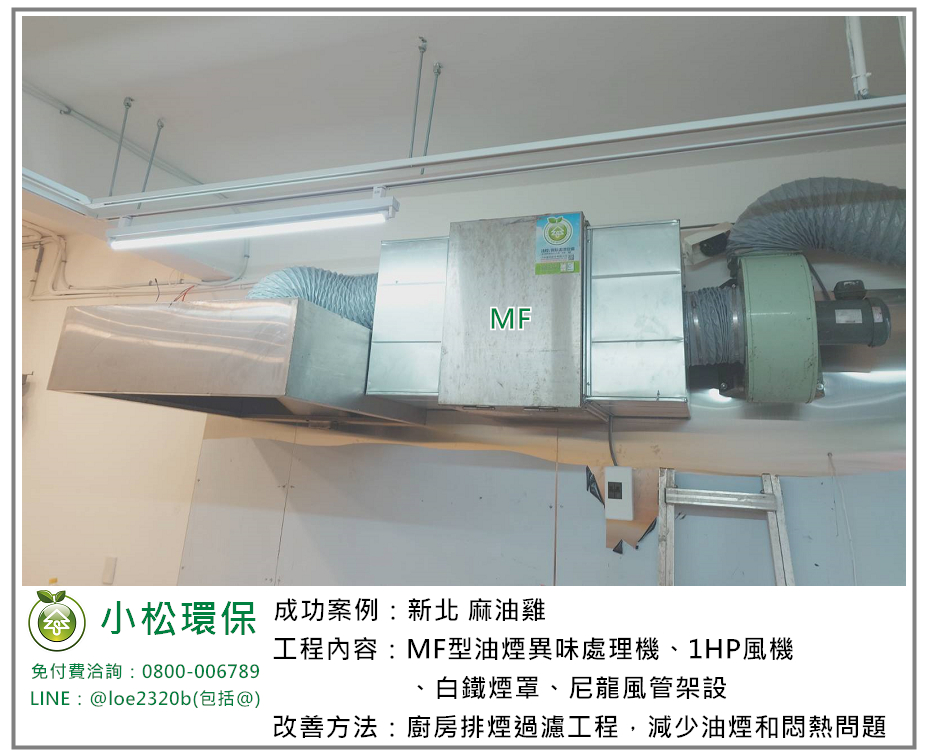 小松環保於 新北  麻油雞  安裝一套餐飲業油煙/異味處理設備,包括 MF型油煙異味處理機、1HP風機、白鐵煙罩、尼龍風管架設。