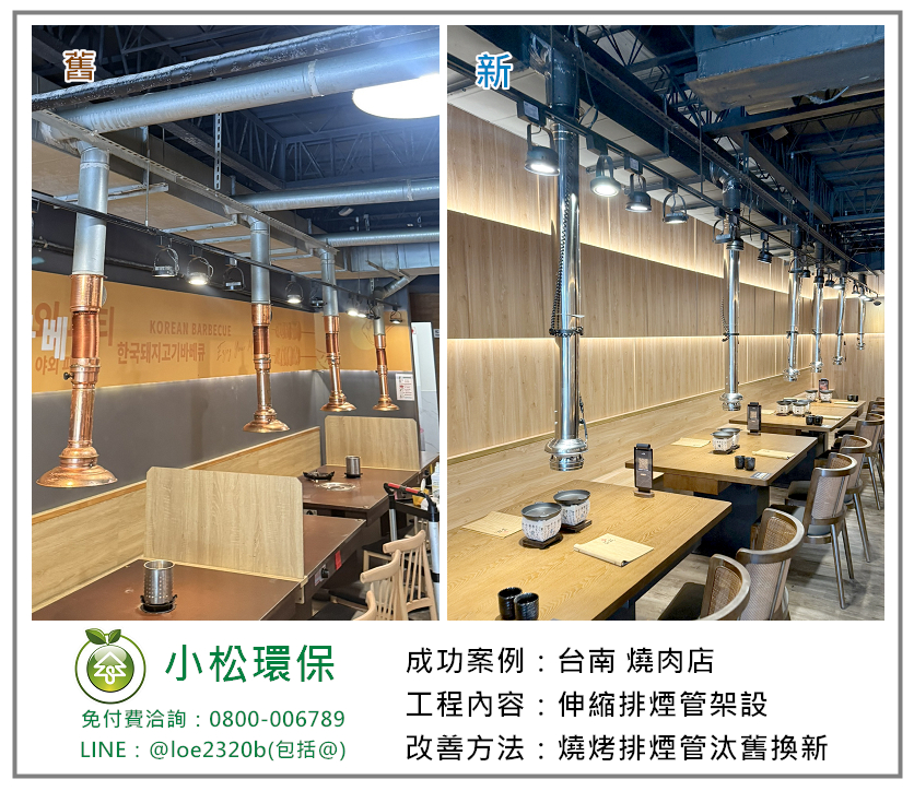 台南某燒肉店重新改裝,想汰換原本的老舊風管,業主在與小松環保的業務溝通之後,更換新的排煙風管。安裝後通風良好,能有效抽離燒肉熱氣異味,不會一直累積在室內,降低因油煙產生的悶熱和健康問題。