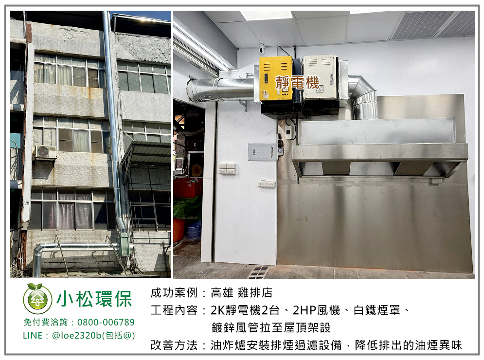 小松環保於 高雄 雞排店 安裝一套餐飲業油煙/異味處理設備,包括 2K靜電機2台、2HP風機、白鐵煙罩、鍍鋅風管拉至屋頂架設。