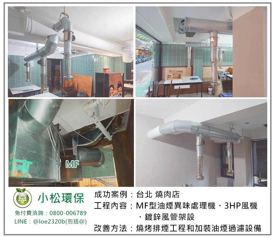 小松環保於 台北 燒肉店 安裝一套餐飲業油煙/異味處理設備,包括 MF型油煙異味處理機、3HP風機、鍍鋅風管架設。