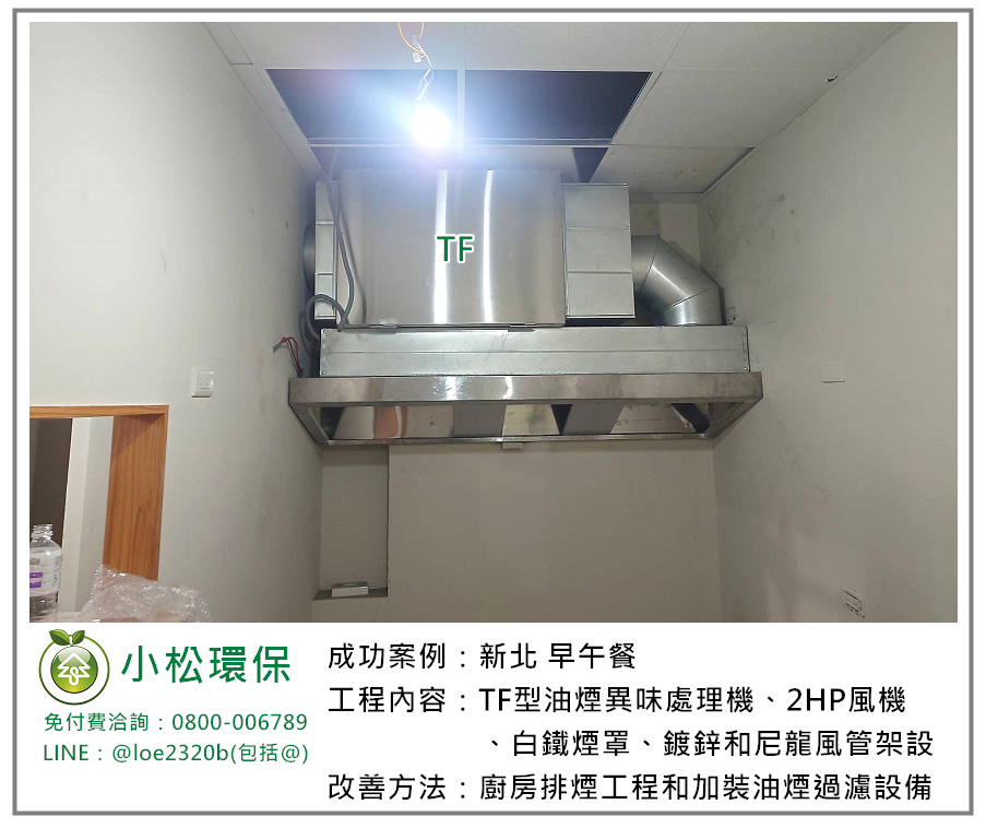 小松環保於 新北 早午餐 安裝一套餐飲業油煙/異味處理設備,包括 TF型油煙異味處理機、2HP風機、白鐵煙罩、鍍鋅和尼龍風管 架設。