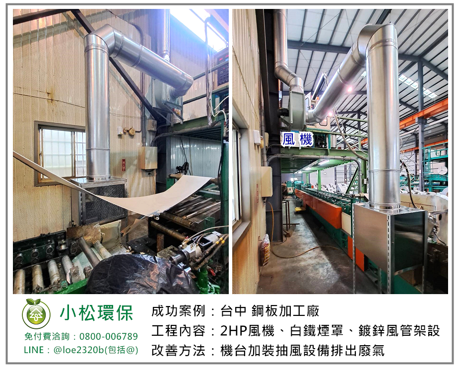 小松環保於 台中 鋼板加工廠 安裝一套餐飲業油煙/異味處理設備,包括 2HP風機、白鐵煙罩、鍍鋅風管架設。