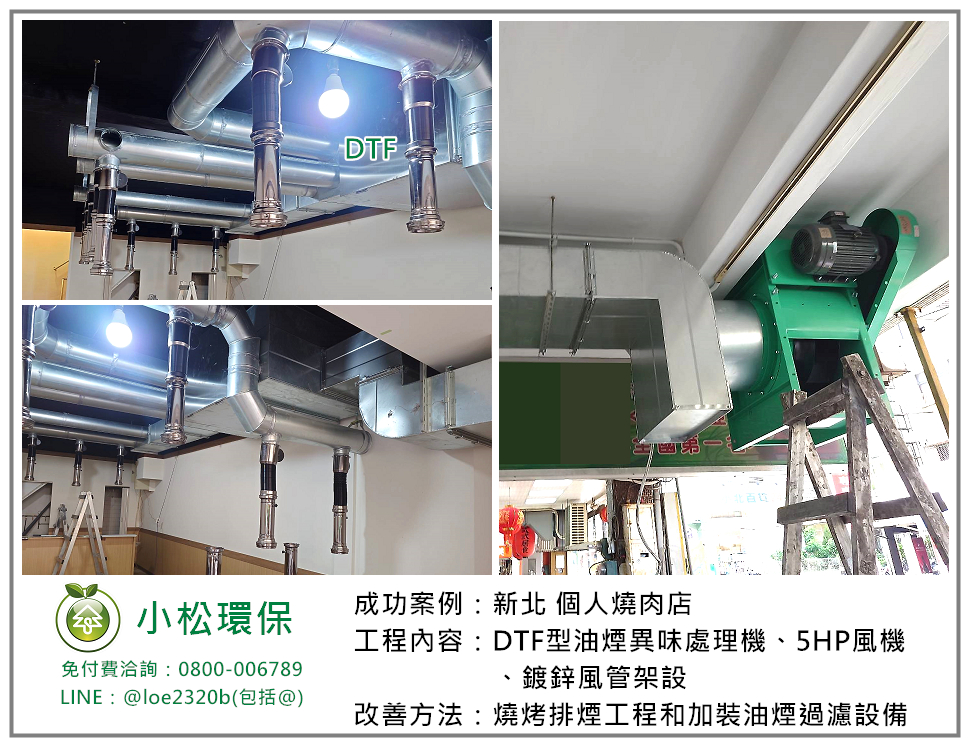小松環保於 新北 個人燒肉店 安裝一套餐飲業油煙/異味處理設備,包括 DTF型油煙異味處理機、5HP風機、鍍鋅風管 架設。