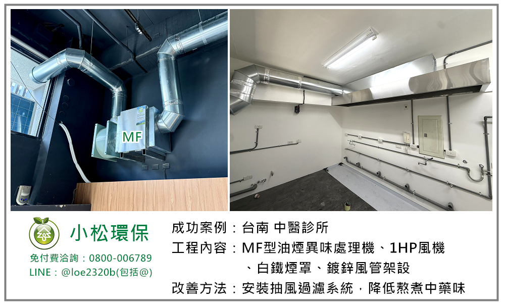小松環保於 台南 中醫診所 安裝一套餐飲業油煙/異味處理設備,包括 MF型油煙異味處理機、1HP風機、白鐵煙罩、鍍鋅風管架設。