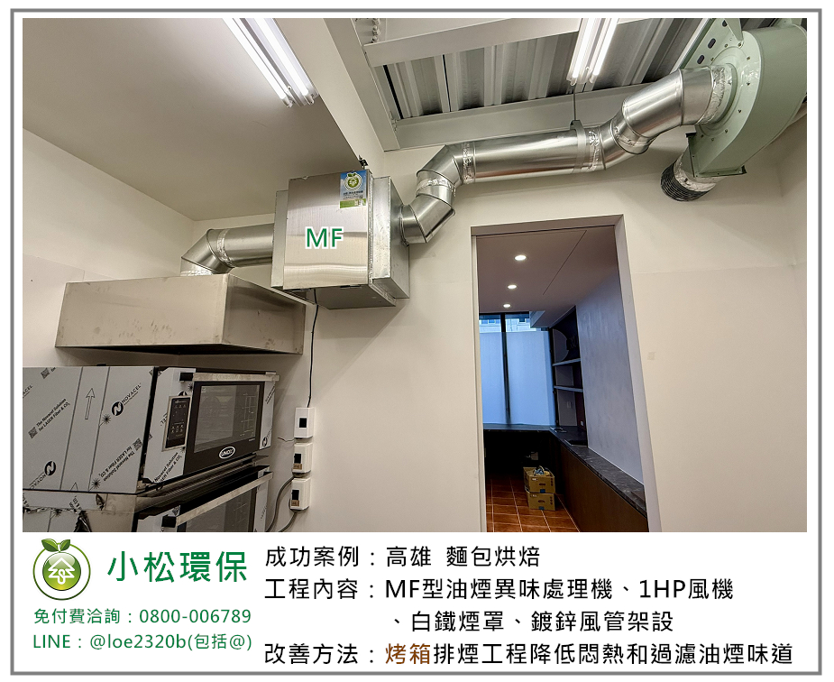 小松環保於 高雄 麵包烘焙 安裝一套餐飲業油煙/異味處理設備,包括 MF型油煙異味處理機、1HP風機、白鐵煙罩、鍍鋅風管架設