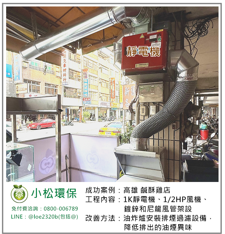 小松環保於 高雄 鹹酥雞店 安裝一套餐飲業油煙/異味處理設備,包括 1K靜電機、1/2HP風機、鍍鋅和尼龍風管