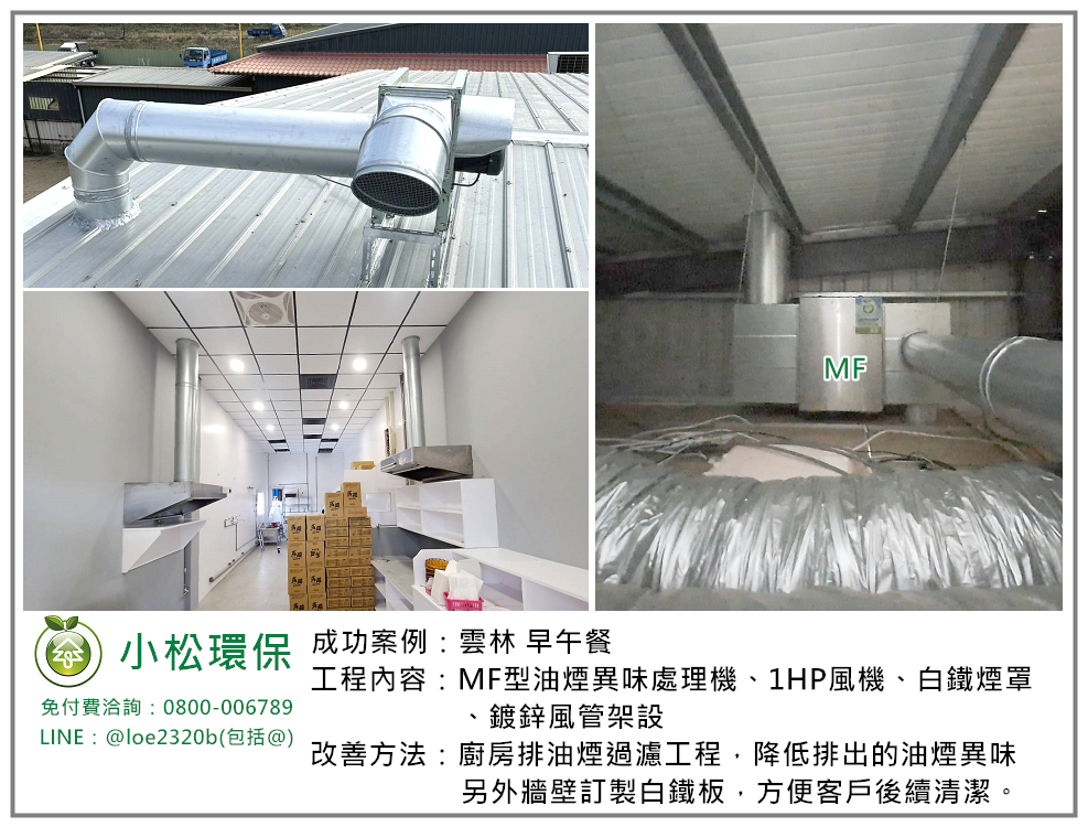 小松環保於 雲林 早午餐 安裝一套餐飲業油煙/異味處理設備,包括 MF型油煙異味處理機、1HP風機、白鐵煙罩、鍍鋅風管架設。