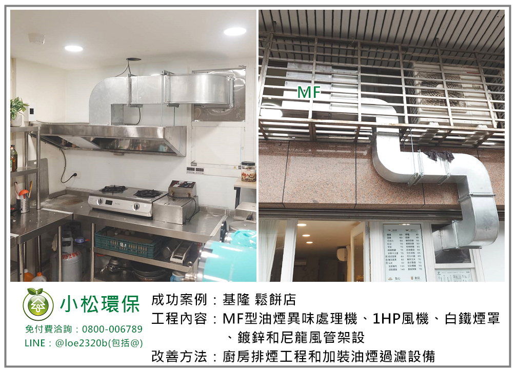 小松環保於 基隆 鬆餅店 安裝一套餐飲業油煙/異味處理設備,包括 MF型油煙異味處理機、1HP風機、白鐵煙罩、鍍鋅和尼龍風管架設。