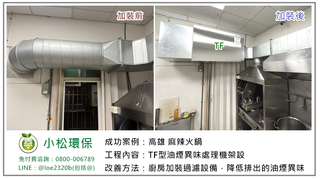 高雄有一間麻辣火鍋店廚房在營運了一段時間後,由於品質穩定價格實在,客人和煮食的餐點量也隨之增加,伴隨而來有油煙及味道的排放問題,業主選擇小松規劃加裝油煙過濾設備改善。