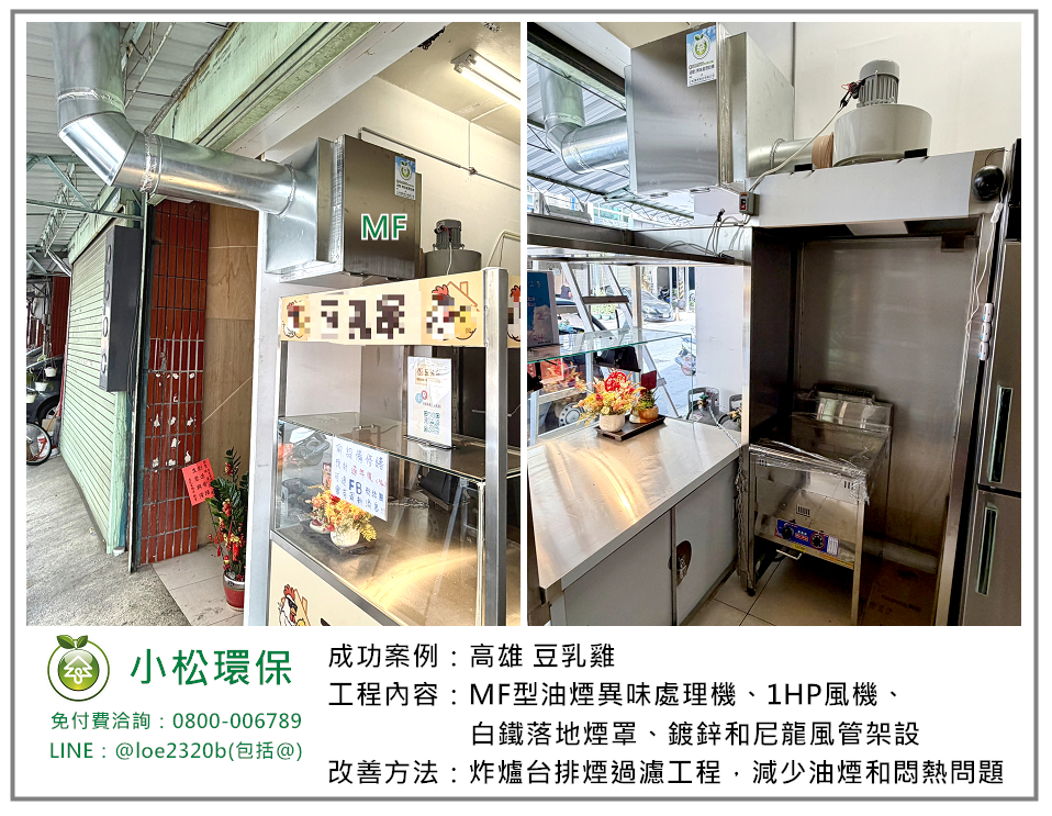 小松環保於 高雄 豆乳雞 安裝一套餐飲業油煙/異味處理設備,包括 MF型油煙異味處理機、1HP風機、白鐵落地煙罩、鍍鋅和尼龍風管架設。