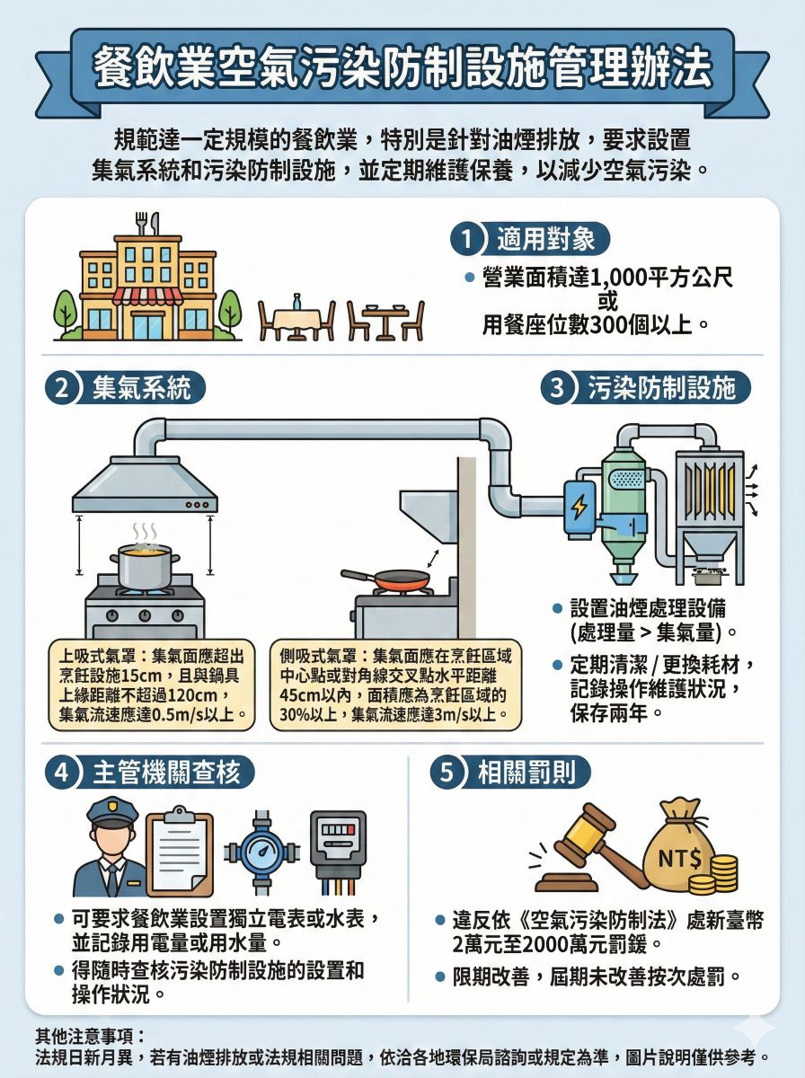 A:「餐飲業空氣污染防制設施管理辦法」是中華民國環保署於110年2月5日訂定的法規,旨在規範達一定規模的餐飲業,特別是針對油煙排放,要求設置集氣系統和污染防制設施,並定期維護保養,以減少空氣污染。