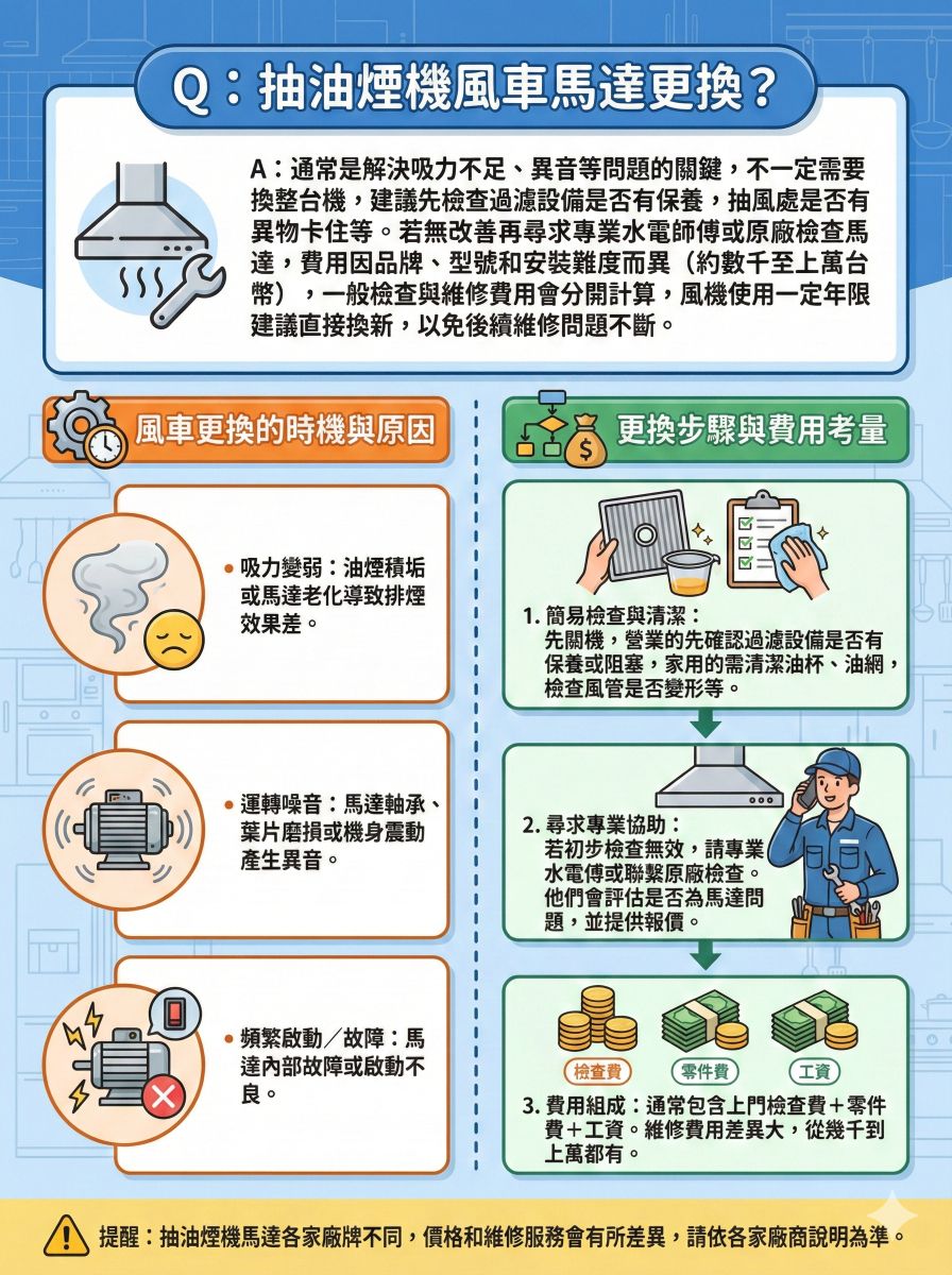 A:抽油煙機馬達更換通常是解決吸力不足、異音等問題的關鍵,不一定需要換整台機,費用因品牌、型號與安裝難度而異(約數千至上萬台幣),建議先檢查過濾設備是否有保養,抽風處是否有異物卡住等,若無改善再尋求專業水電師傅或原廠檢查馬達,檢查與維修費用會分開計算,使用一定年限建議直接換新,以免後續維修問題不斷。
