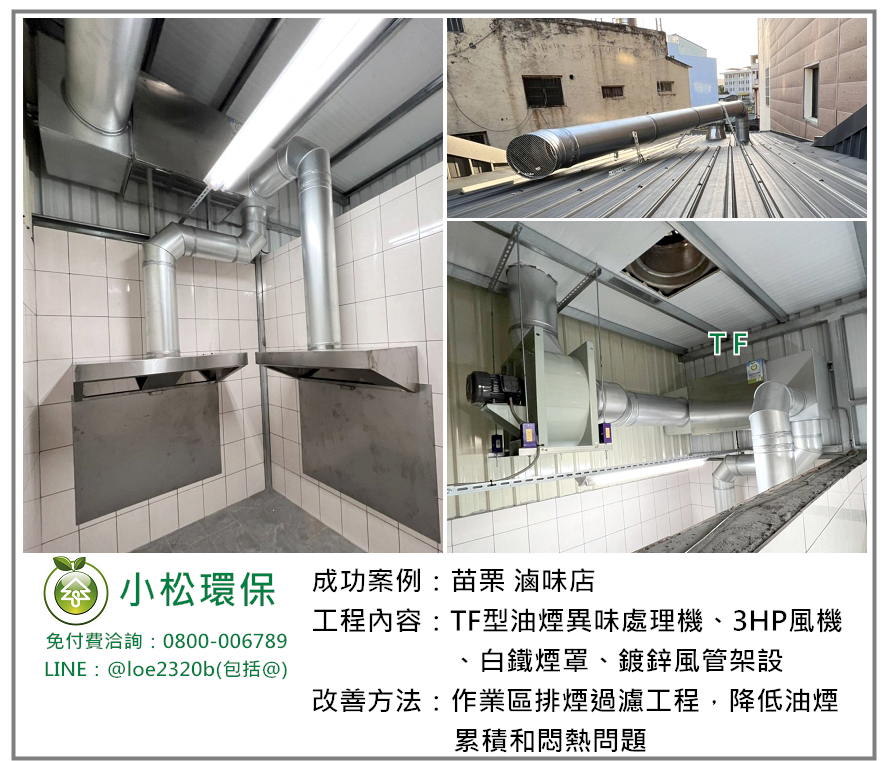 小松環保於 苗栗 滷味店 安裝一套餐飲業油煙/異味處理設備,包括 TF型油煙異味處理機、3HP風機、白鐵煙罩、鍍鋅風管架設。