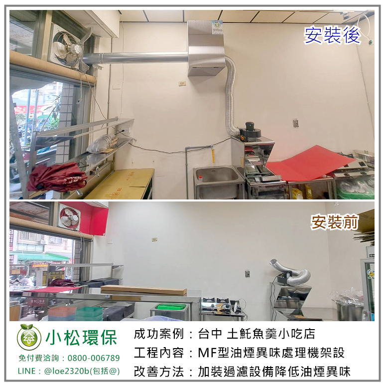 台中有一間土魠魚羹小吃店在營運了一段時間後,客人和煮食的餐點量也隨之增加,伴隨而來油煙及味道量增加等問題,因此在整修時選擇小松加裝一套過濾設備,降低油煙排出影響周圍環境等問題。