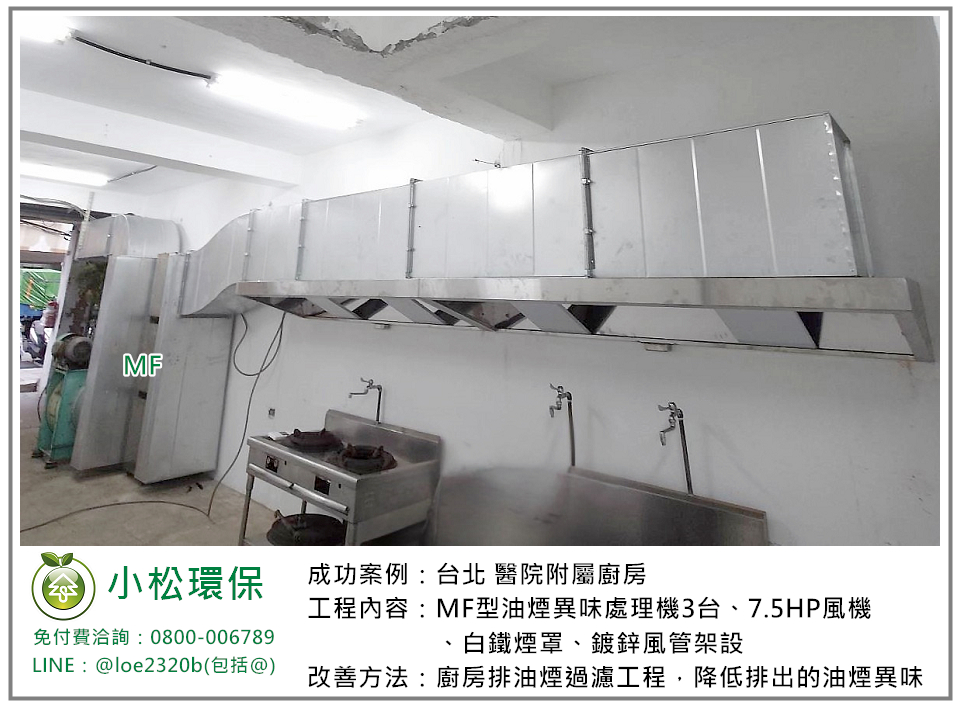 小松環保於 台北 醫院附屬廚房 安裝一套餐飲業油煙/異味處理設備,包括 MF型油煙異味處理機3台、7.5HP風機、白鐵煙罩、鍍鋅風管架設。