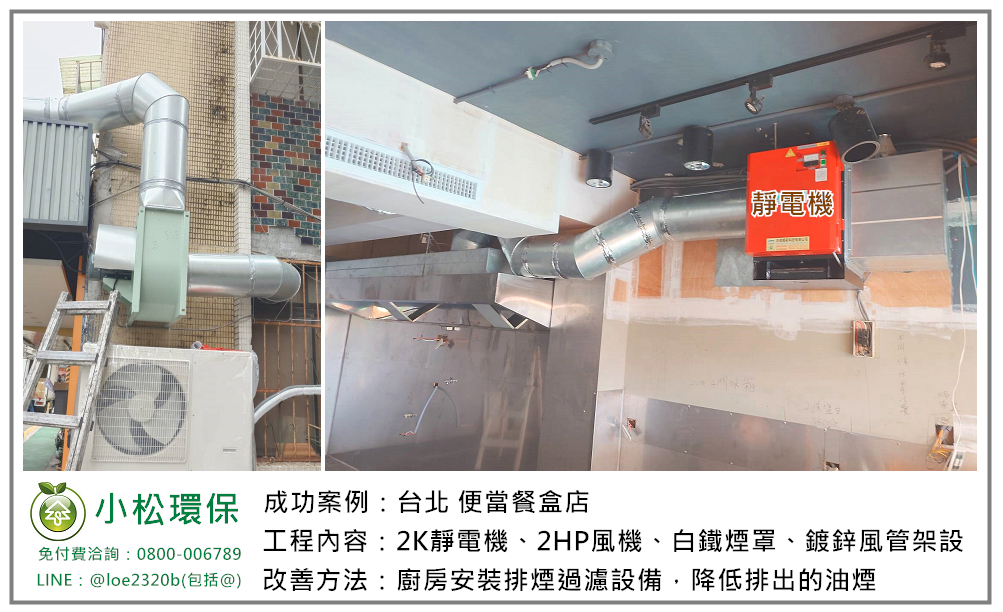 小松環保於 台北 便當餐盒店 安裝一套餐飲業油煙/異味處理設備,包括 2K靜電機、2HP風機、白鐵煙罩、鍍鋅風管架設。