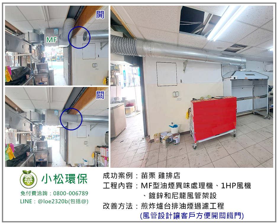 小松環保於 苗栗 雞排店 安裝一套餐飲業油煙/異味處理設備,包括 MF型油煙異味處理機、1HP風機、鍍鋅和尼龍風管架設(風管設計讓客戶方便開關鐵門)。