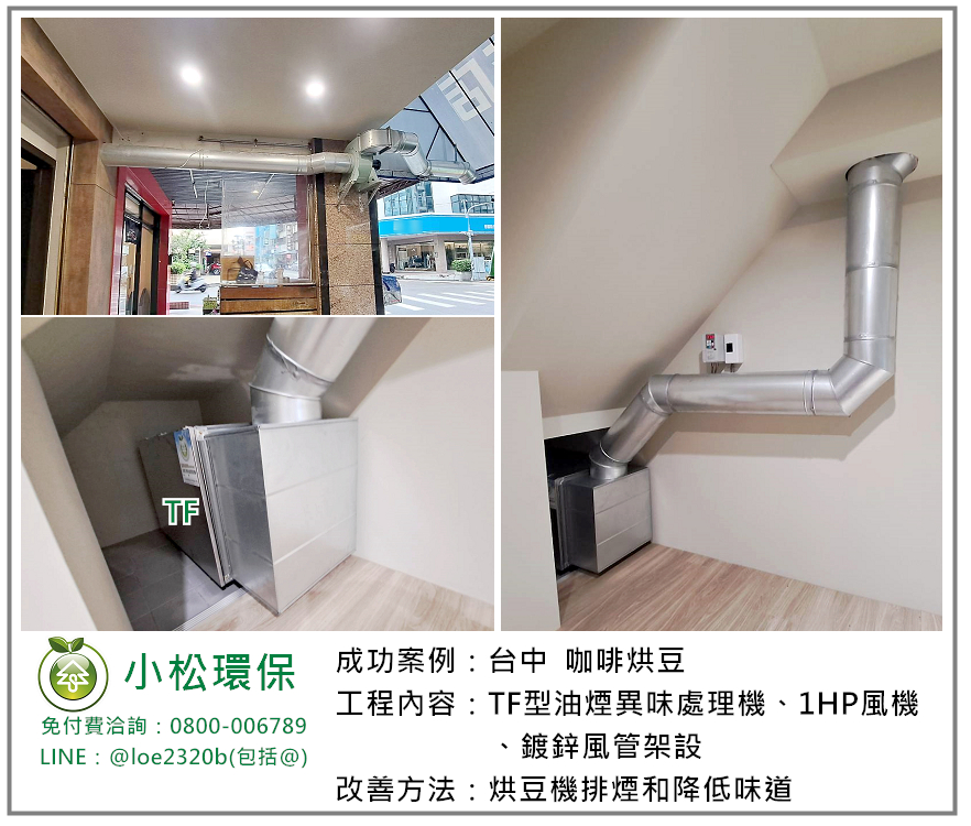 小松環保於 台中 咖啡烘豆 安裝一套餐飲業油煙/異味處理設備,包括 TF型油煙異味處理機、1HP風機、鍍鋅風管架設。