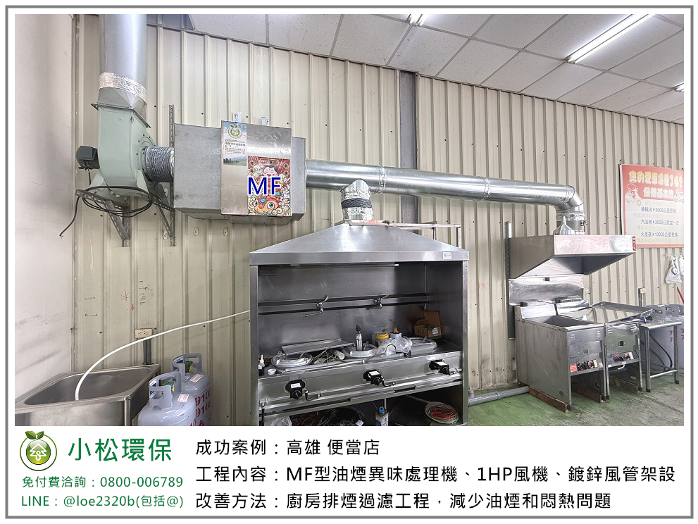 小松環保於 高雄 便當店 安裝一套餐飲業油煙/異味處理設備,包括 MF型油煙異味處理機、1HP風機、鍍鋅風管架設。