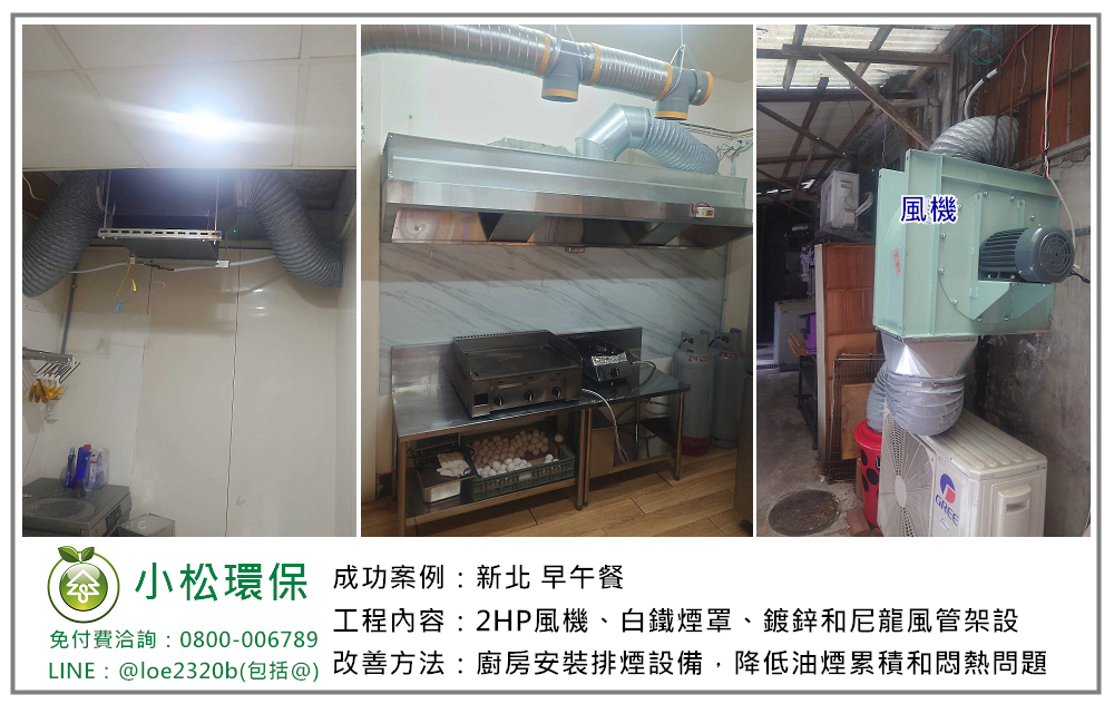 小松環保於 新北 早午餐 安裝一套餐飲業油煙/異味處理設備,包括 2HP風機、白鐵煙罩、鍍鋅和尼龍風管架設。