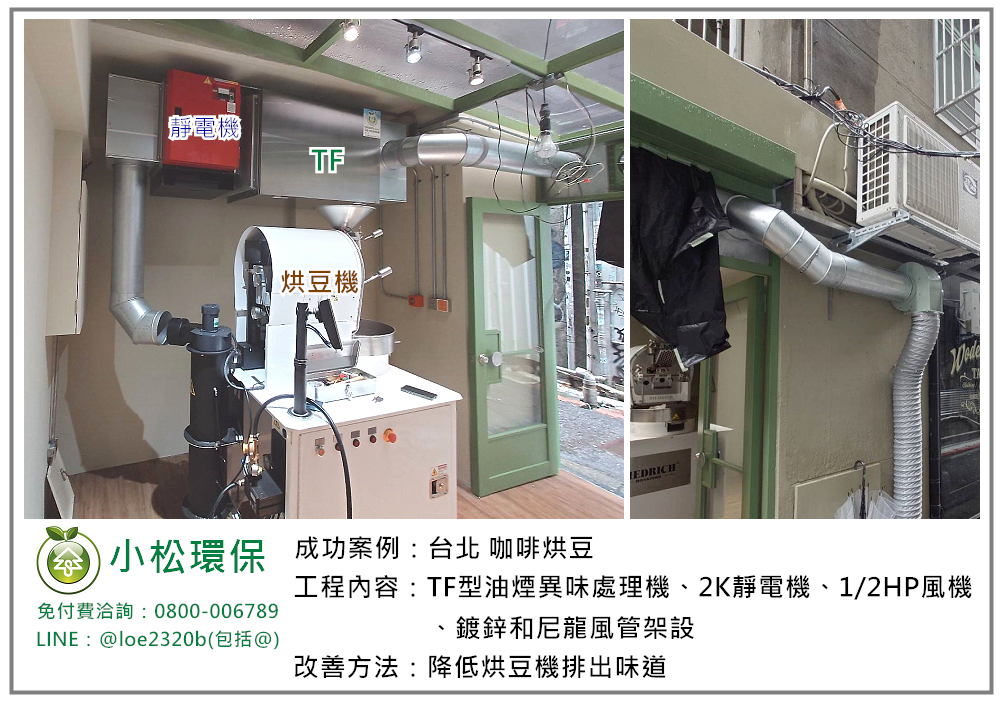 小松環保於 台北 咖啡烘豆 安裝一套餐飲業油煙/異味處理設備,包括 TF型油煙異味處理機、2K靜電機、1/2HP風機、鍍鋅和尼龍風管架設。