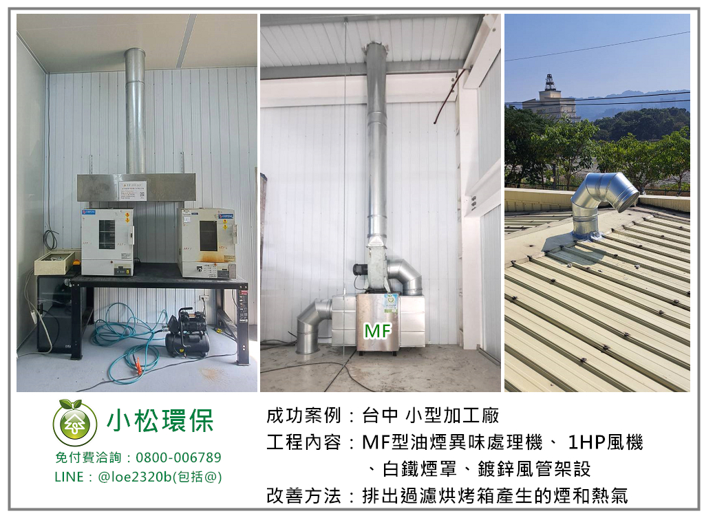小松環保於 台中 小型加工廠 安裝一套餐飲業油煙/異味處理設備,包括 MF型油煙異味處理機、1HP風機、白鐵煙罩、鍍鋅風管架設。