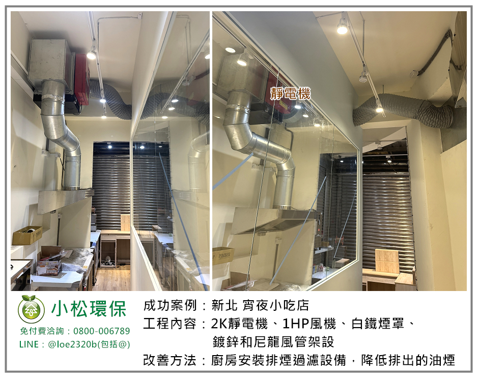 小松環保於 新北 宵夜小吃店 安裝一套餐飲業油煙/異味處理設備,包括 2K靜電機、1HP風機、白鐵煙罩、鍍鋅和尼龍風管架設。