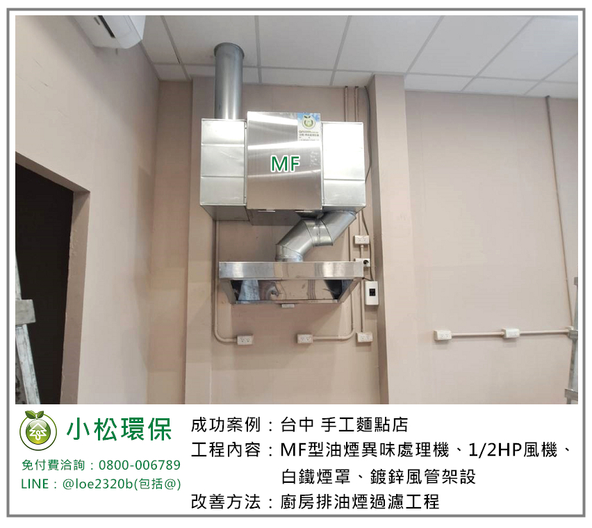 小松環保於 台中 手工麵點店 安裝一套餐飲業油煙/異味處理設備,包括 MF型油煙異味處理機、1/2HP風機、白鐵煙罩、鍍鋅風管架設。