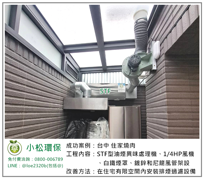 小松環保於 台中 住家燒肉 安裝一套餐飲業油煙/異味處理設備,包括 STF型油煙異味處理機、1/4HP風機、白鐵煙罩、鍍鋅和尼龍風管架設。