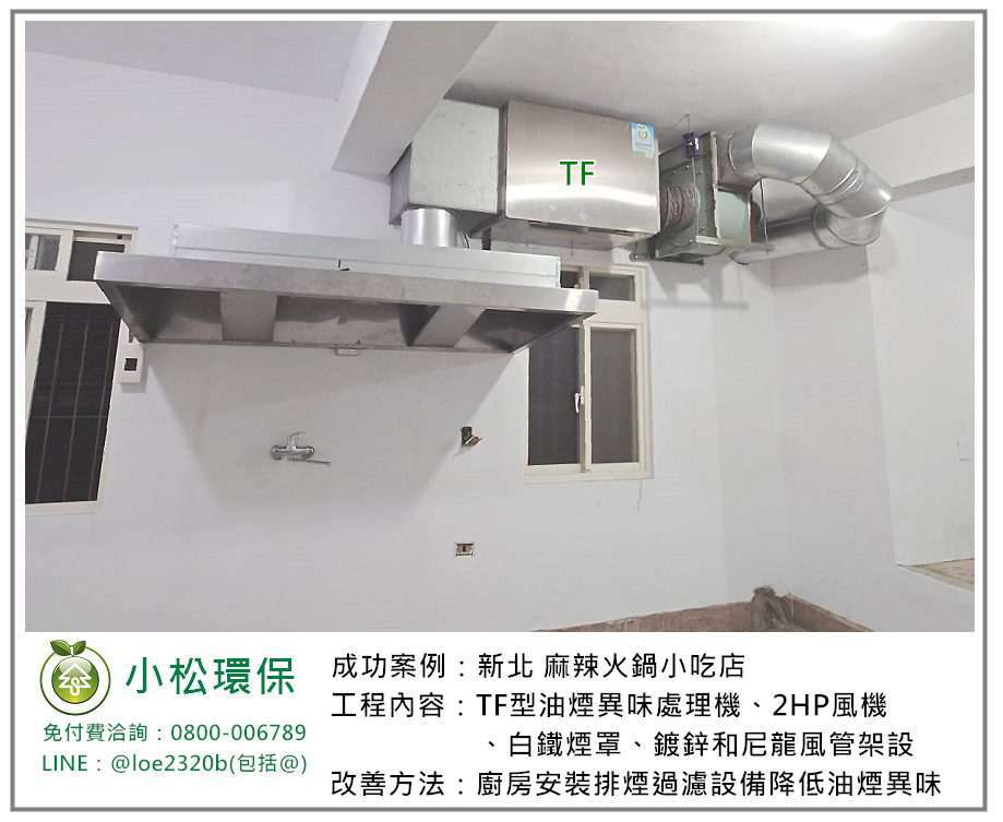 小松環保於 新北 麻辣火鍋小吃店 安裝一套餐飲業油煙/異味處理設備,包括 TF型油煙異味處理機、2HP風機、白鐵煙罩、鍍鋅和尼龍風管 架設。