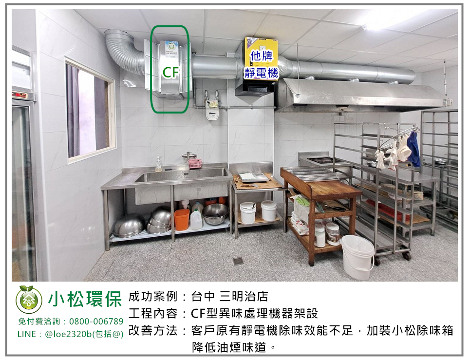 台中有一間三明治店在營運了一段時間後,客人和煮食的餐點量也隨之增加,伴隨而來油煙及味道量增加等問題,原本設備已有靜電機,業主因此在整修時選擇加裝小松除味箱降低味道影響周圍環境。