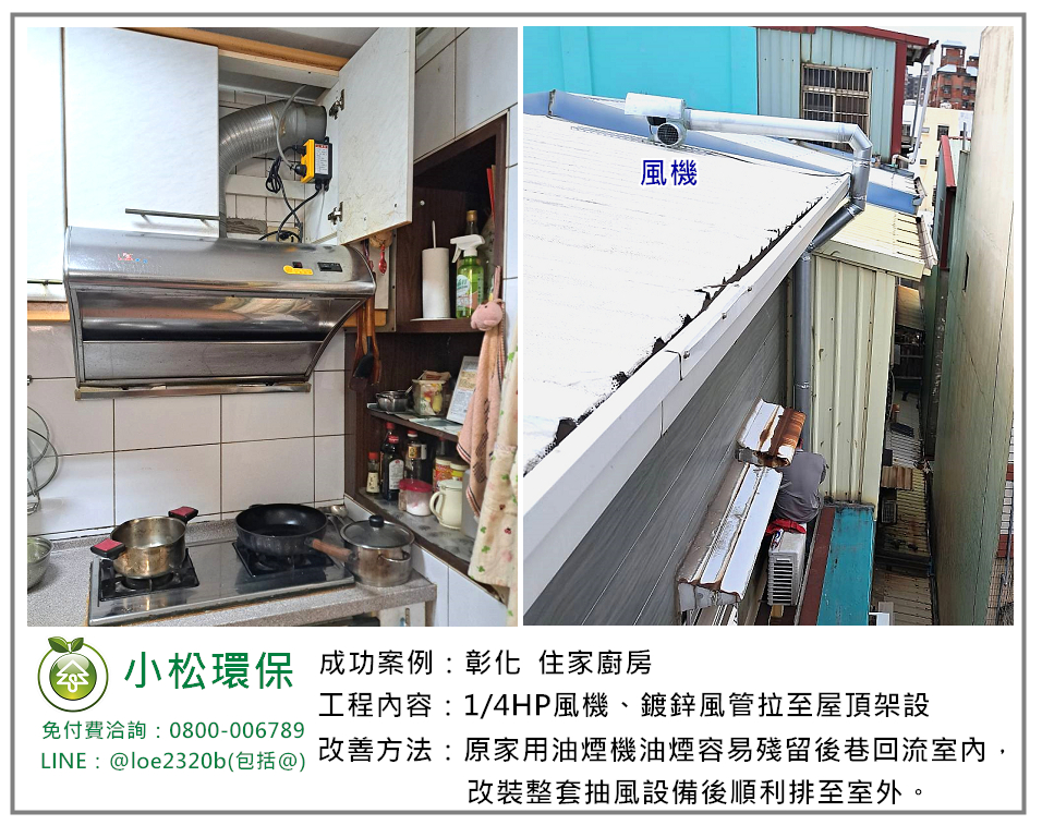 彰化某住戶因家用抽油煙機排出油煙後,容易殘留後巷回流室內和小松接洽。小松施以抽風工程,在排煙管後段加裝抽風馬達,讓抽風足夠將瓦斯爐產生的煙導出室外屋頂不會一直累積,降低煮飯時因油煙產生的不舒服和悶熱問題。