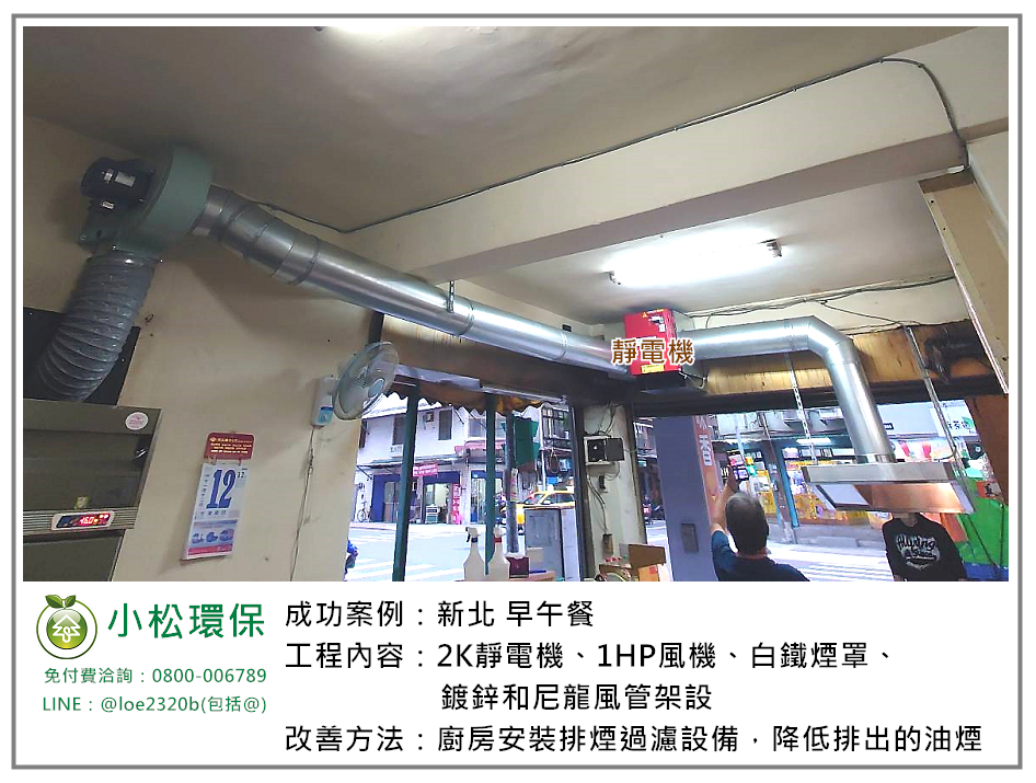小松環保於 新北 早午餐 安裝一套餐飲業油煙/異味處理設備,包括 2K靜電機、1HP風機、白鐵煙罩、鍍鋅和尼龍風管架設。