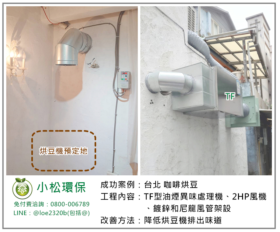 小松環保於 台北 咖啡烘豆 安裝一套餐飲業油煙/異味處理設備,包括 TF型油煙異味處理機、2HP風機、鍍鋅和尼龍風管架設。