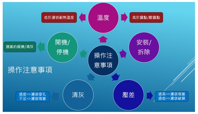 溫溼度的控制是袋濾式集塵設備最主要操作因素之一,溫度過高會導致濾袋的急速老化甚至是脆化,而溫度若低於露點/酸露點,則可能造成集塵設備內出現水滴/酸,進一步導致濾袋上的粉塵因結露而無法震落/濾袋或支架籠被酸侵蝕。