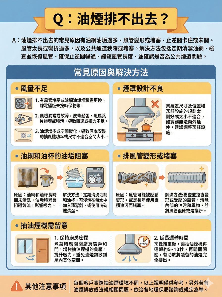 A:油煙排不出去的常見原因有油網油垢過多、風管變形或堵塞、止逆閥卡住或未開、風管太長或彎折過多,以及公共煙道狹窄或堵塞。 解決方法包括定期清潔油網、檢查並恢復風管、確保止逆閥暢通、縮短風管長度、並確認是否為公共煙道問題。