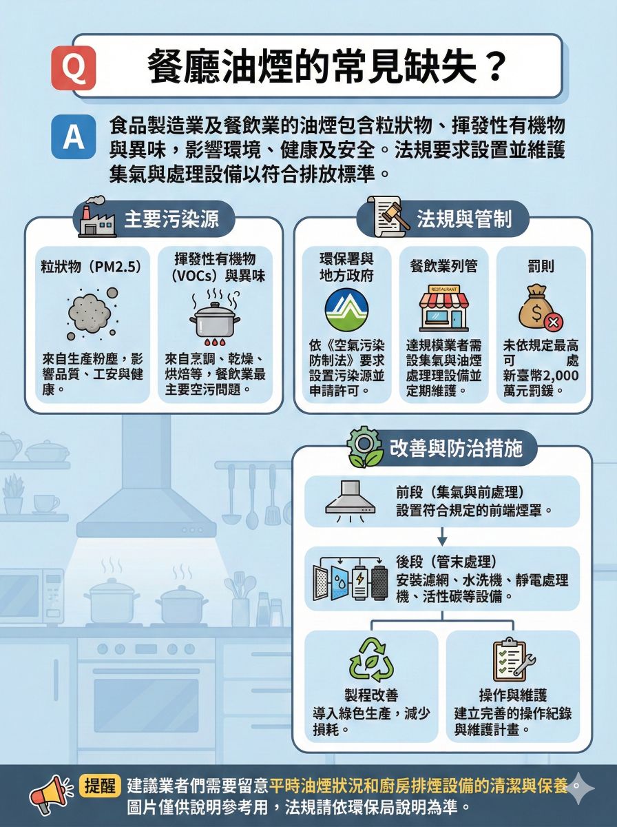 A:餐廳油煙的常見缺失包含:未設置或效能不足的防制設備、設備維護不良(如油網阻塞、風車馬力不足)、排煙管線設置不當(如排氣口位置影響鄰居、油垢積結)、油煙處理設施的選擇不當(如水洗機維護不良),以及油煙處理未確實,如排放到下水道造成阻塞等。