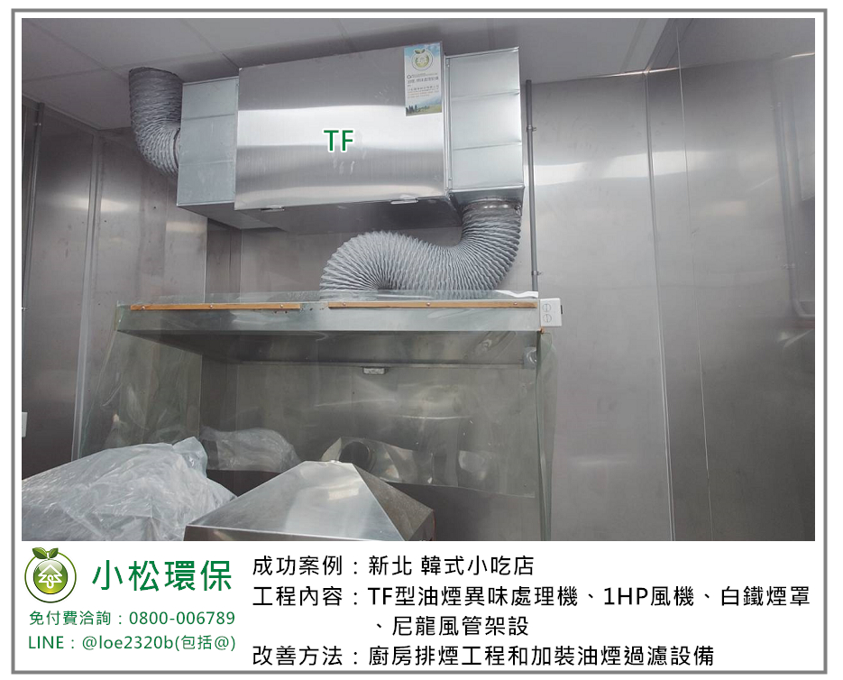 小松環保於 新北 韓式小吃店,完成裝設一式餐飲業油煙/異味處理設備,包括 F型油煙異味處理機、1HP風機、白鐵煙罩、尼龍風管架設。TF型具有三道濾材:前兩道濾材主要在過濾油煙,油煙去除效果可達95%以上,第三道為改質之活性碳,主要在吸附味道,異味去除效果可達60%以上,能夠同時有效改善油煙異味問題,安裝後